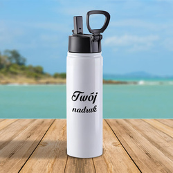 Biały bidon 850 ml - z rączką i zamykanym ustnikiem - z Twoim nadrukiem - czarna opaska