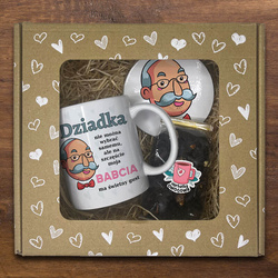 Zestaw prezentowy w kartoniku w serduszka - kubek Jego Wysokość Dziadek + herbata