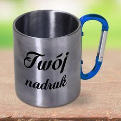 Srebrny, metalowy kubek z niebieskim karabińczykiem z Twoim nadrukiem