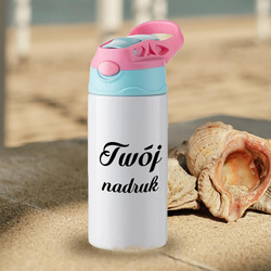 Dziecięcy bidon z silikonowym ustnikiem z Twoim nadrukiem - biały z błękitno-różową zakrętką