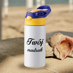 Dziecięcy bidon z silikonowym ustnikiem z Twoim nadrukiem - biały z żółto-niebieską zakrętką