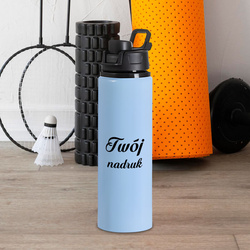 Srebrny bidon 850 ml - z rączką i zamykanym ustnikiem - z Twoim nadrukiem - niebieska opaska