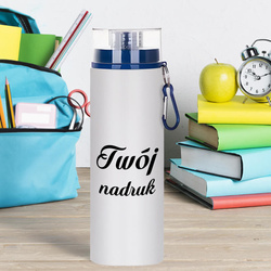Biały bidon 850 ml z Twoim nadrukiem niebieski karabińczyk